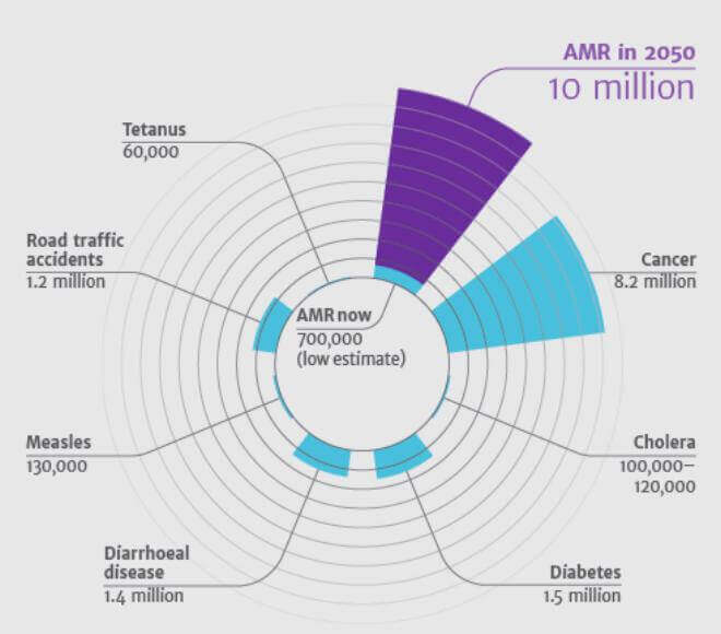 According to the O’Neil report, AMR kills an estimated 700,000 people worldwide each year, a number that could rise to 10 million by 2050 (which is estimated to be more than cancer deaths) if the problem is left unresolved.13