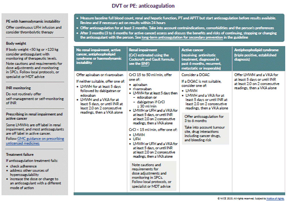 NICE recommends that therapeutic anticoagulation should be initiated immediately, preferably with a LMWH, fondaparinux, rivaroxaban, or UFH (see Figure 2, 3 & 4 below).